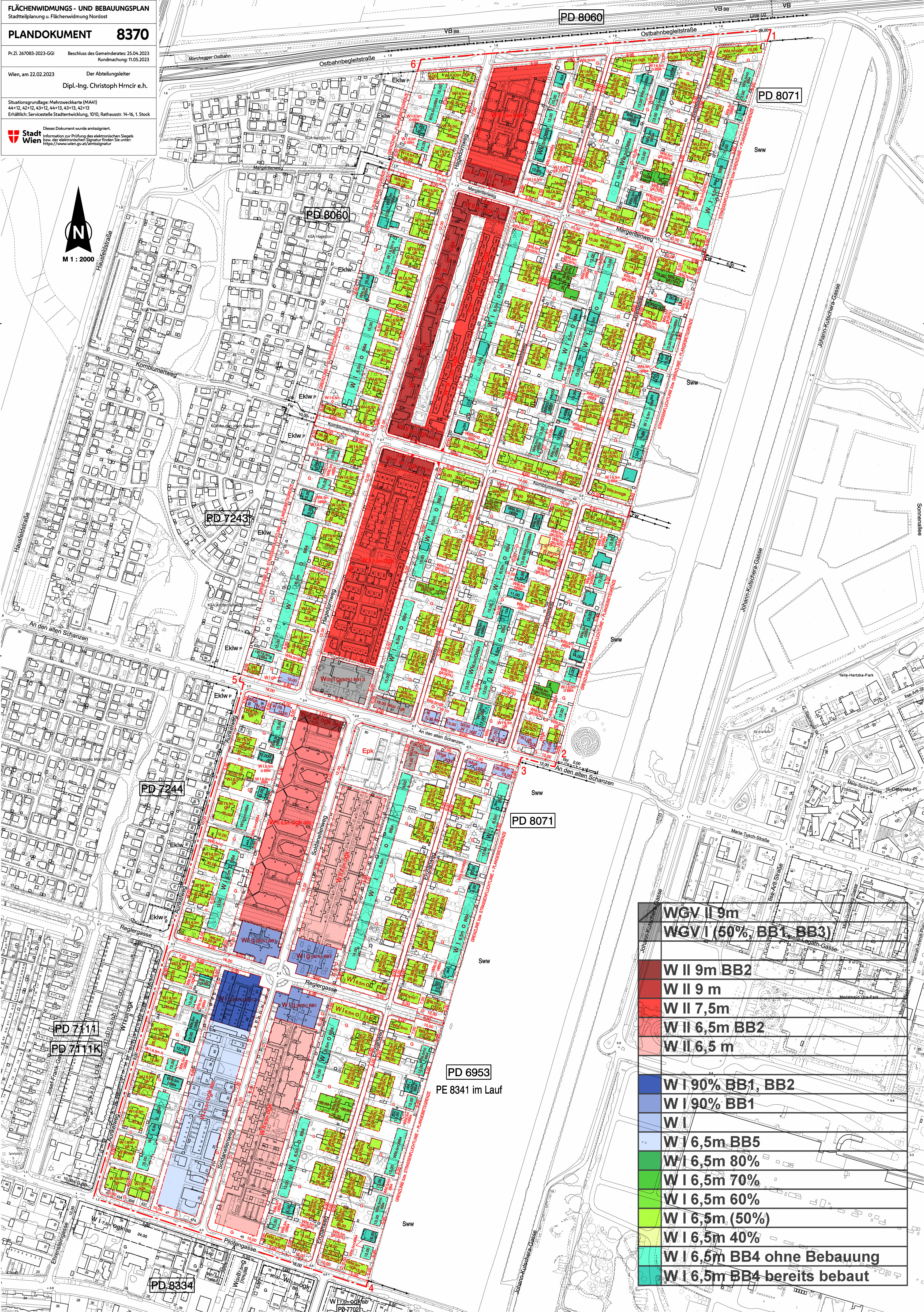 Schnell erkennbar sind die fehlenden zweiten Bauplätze in den hinteren Grundstücksteilen, und die Bauklasse W II in den Quergassen.