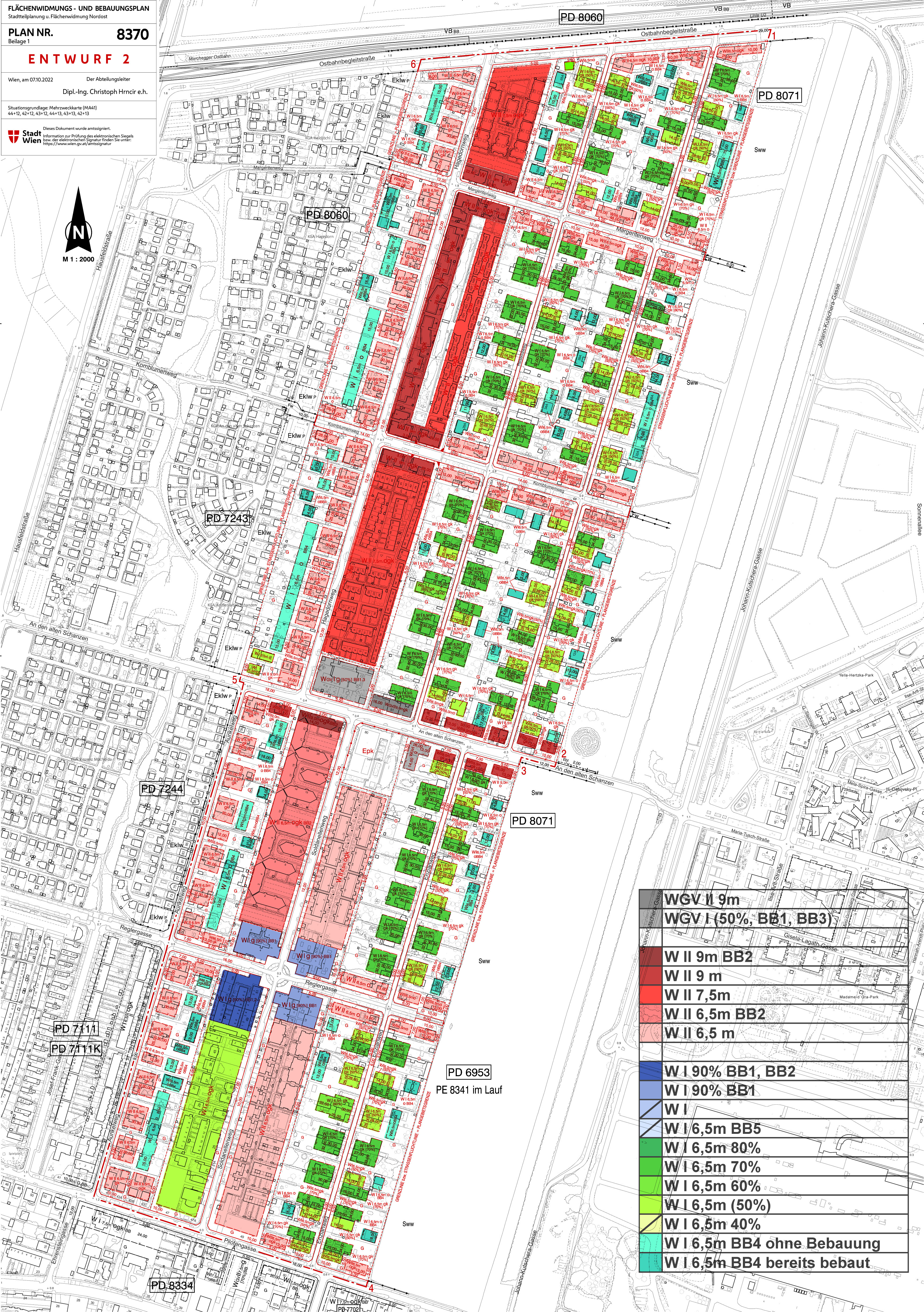 Zum Vergleich haben wir auch noch eine Ausarbeitung des zweiten Entwurfs der Bebauungsbestimmungen bekommen, wo erkennbar ist, wie die Gemeinde Wien die Flächenwidmung ursprünglich ändern wollte. Durch die Einflussnahme des Siedlervereins wurden dann doch noch einige Anpassungen zugunsten der Siedler übernommen.